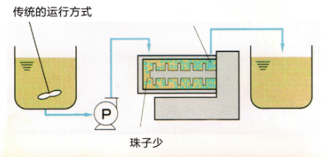 循環(huán)操作只需一個(gè)或兩個(gè)攪拌桶實(shí)現(xiàn)循環(huán)砂磨,而且攪拌桶內(nèi)粗顆粒會(huì)快速沉淀而優(yōu)科學(xué)入砂磨腔砂磨。